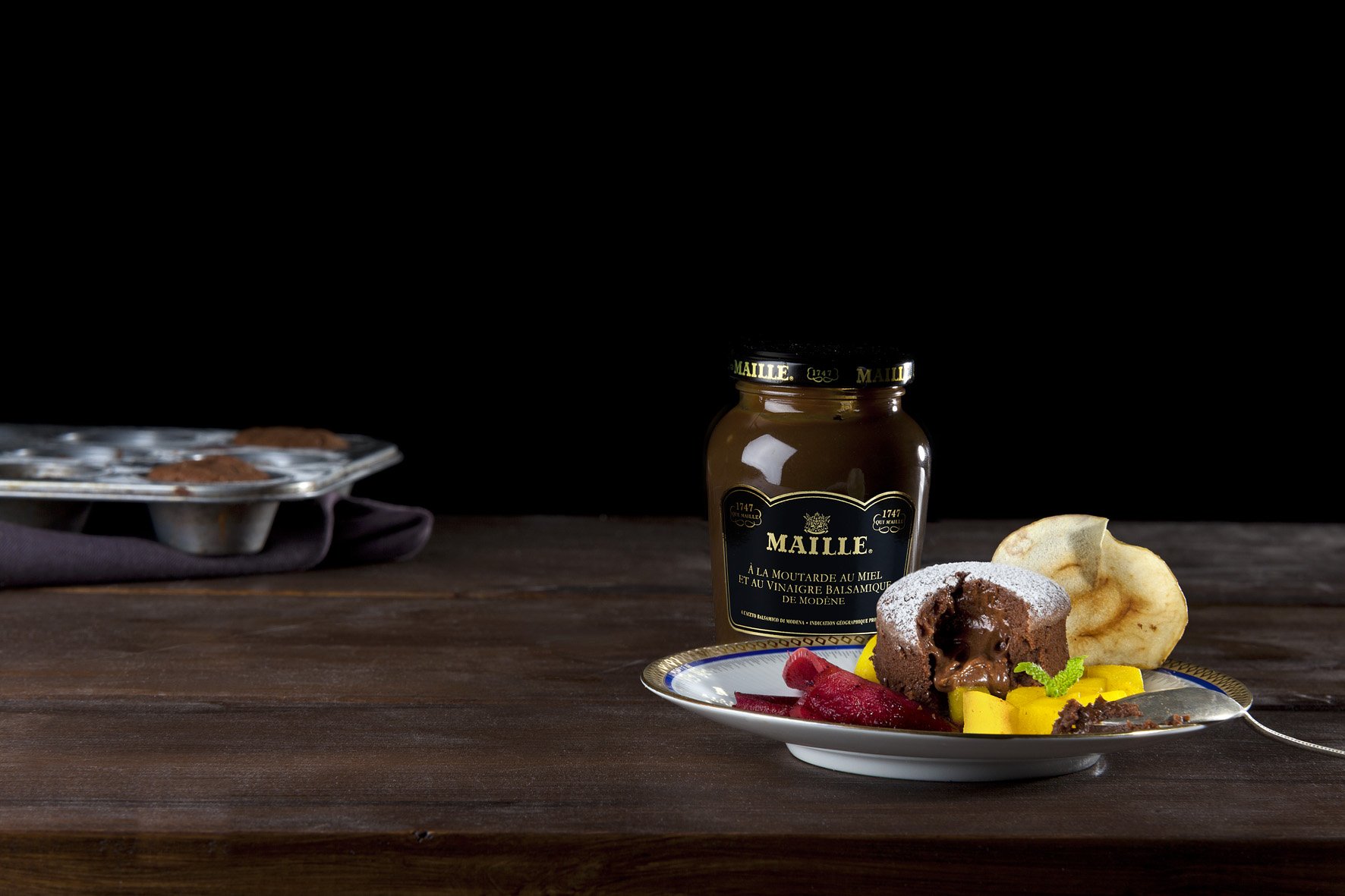 Für das SCHOKOLADEN-SOUFFLÉ, Butter in einem Topf erwärmen, klein geschnittene Schokolade zugeben und schmelzen lassen. Eier trennen, Eiweiß mit der Hälfte des Zuckers steifschlagen. Eigelb mit Senf verrühren.